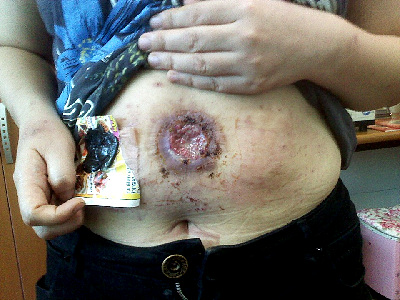 그런데, 또 다른 문제는 사진처럼 재래식 뜸을 한 자리의 피부의 상피세포가 모두 타버려 상처가 심각할 정도였으며 상처의 치유가 더 큰 문제였습니다.